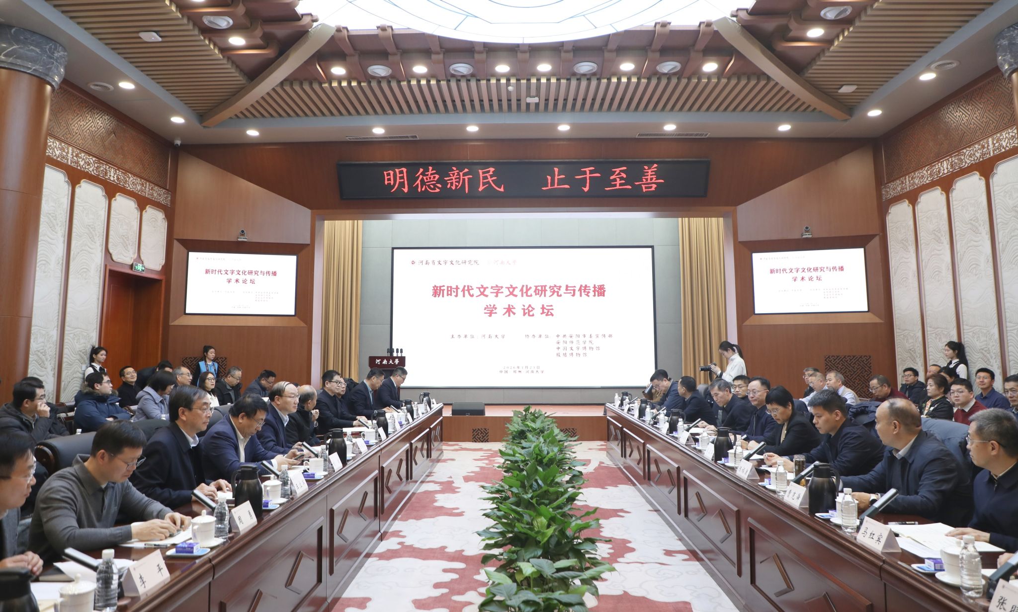 1月23日,“新时代文字文化研究与传播”学术论坛在河南大学郑州龙子湖校区举行。河南省社科联主席李庚香,中共河南省委宣传部二级巡视员葛卫华,河南省文化和旅游厅党组成员、副厅长翟传鸣,教育部语言文字信息管理司领导陈福康,哈尔滨工业大学党委常委、副校长刘挺,河南省教育厅二级巡视员曹克舜,河南省卫生健康委员会二级巡视员熊文兴,安阳市副市长马红宾,河南省农业农村厅网宣处处长张道亮,河南文旅投资集团总经理助理、战略规划投资总监、省文化产业公司董事长张晓鹏等领导及专家学者,河南大学校长、中国科学院院士张锁江,校党委副书记李平、杨萌芽,学术副校长海霞及我校相关单位负责同志、师生代表出席论坛开幕式。开幕式由副校长张向东主持。