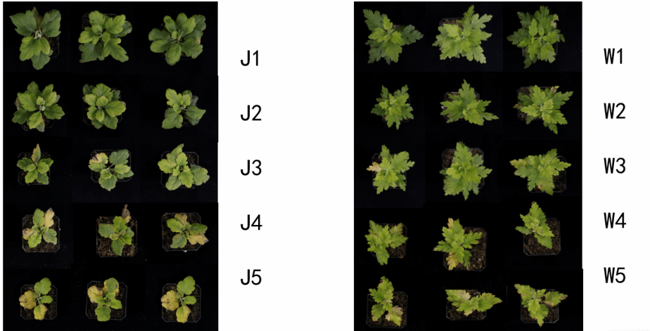 图5A 不同处理条件下菊花叶片生长状况