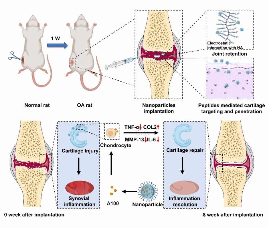 图 纳米粒药物递送系统关节腔驻留、软骨渗透及对骨关节炎治疗机制示意图
